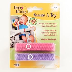 Secure-A-Toy 2 pack: Best Seller. Never lose another baby toy. These simple straps give a safe attractive method for keeping baby's toys close at hand. Just snap one end to the child's toy and one other end to car seat, stroller, high seat, etc. Machine washable. Assorted colors. Made in USA.